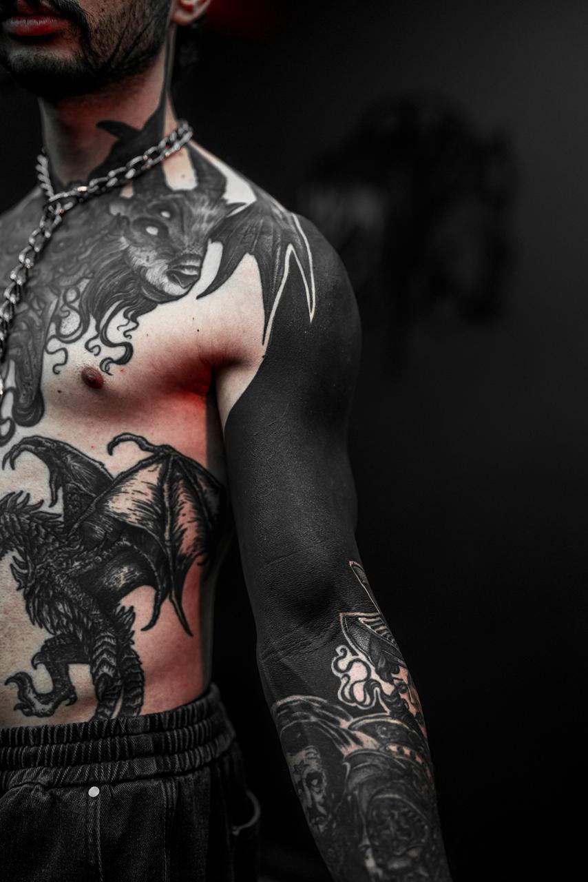 Camadas densas de preto profundo para criar novos contornos ou ressignificar grandes áreas do corpo. Planejo o fluxo da tinta para que o acabamento fique uniforme e contrastado com a pele.